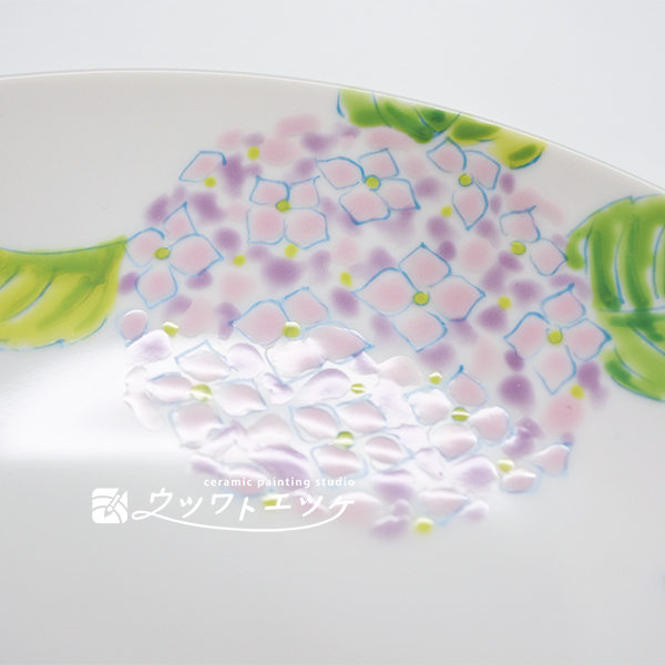 TOP > 講座・テキスト/講座のご案内 > はじめてでもOKの講座 > ~ペンワークと盛り絵具を学ぶ~ 器を選んで描くアジサイ