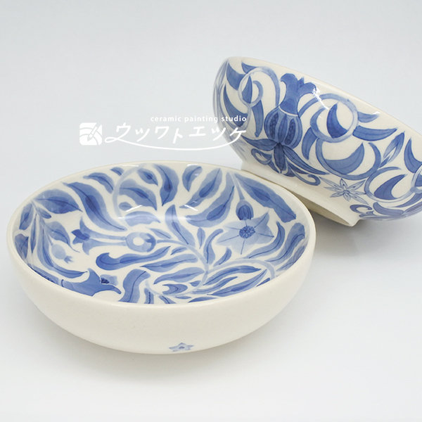 素焼きに呉須を使い、2つの小鉢にデザインの違う唐草文様を描きます。