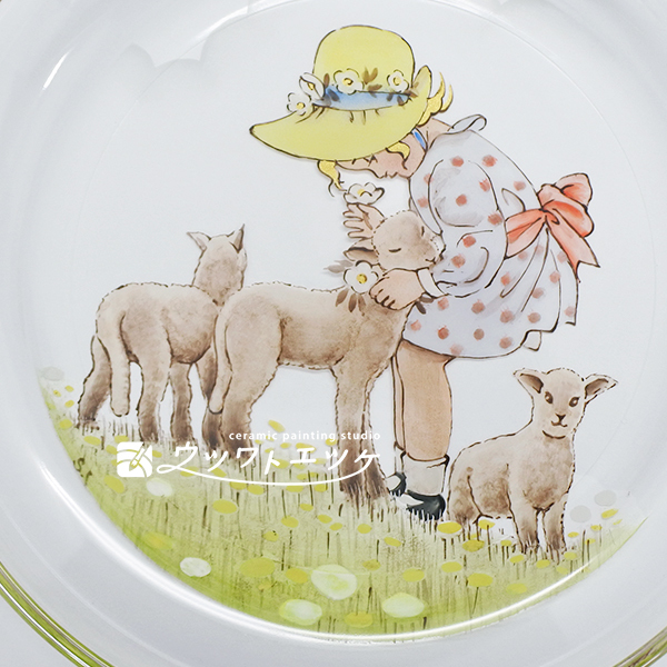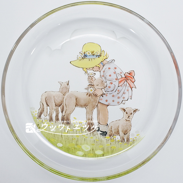 女の子と仔羊のいる、花が咲く牧場の風景のガラスプレートを制作しながら、ガラス絵付けの基本的な技法とガラス絵具の多色使いやホワイトの表現方法を学びます。