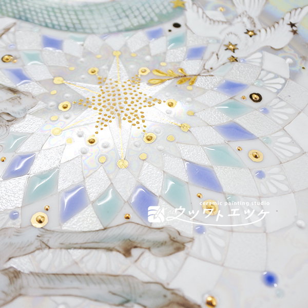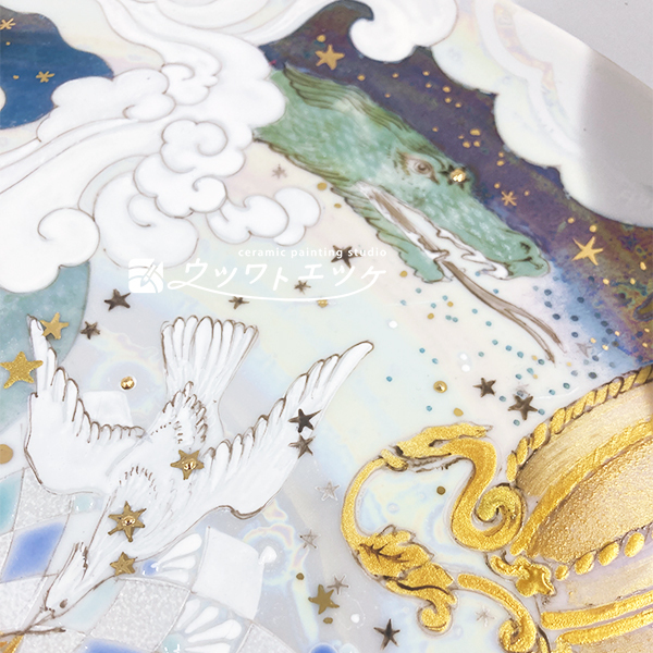制作工程では、メタリック絵具・ジュエル絵具・盛り絵具・ラスターを使用し、きらめきや立体感のある表現を学びます。