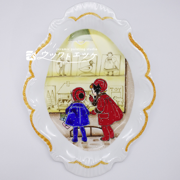 人物が描かれたクリスマスの風景を、赤系絵具やレリーフパウダーなどいろいろな絵具で色付けし、さらに白磁の縁をレリーフパウダーとガラスビーズで装飾して小さな額縁風の作品をつくります。