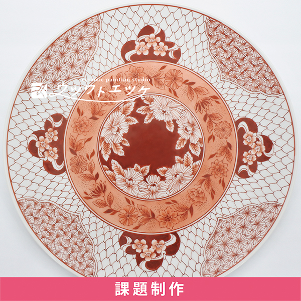面相筆を使った細い線の描き方をメインに学びながら、油性の溶剤を使った表現など、さまざまな技法を取り入れながら赤絵の大皿を仕上げます。