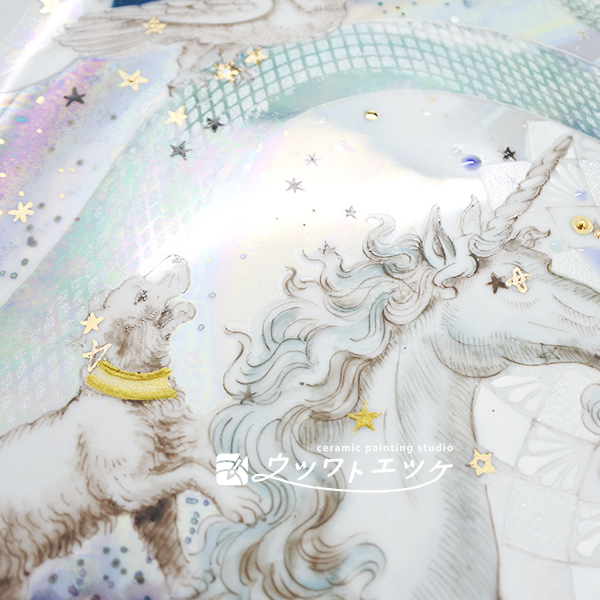 配色や仕上がりは自由度が高く、好きな星座へ変えたり、色数を増やしたり、ラスターを絵具に替えるなど、ご自身の感性に合わせたアレンジを相談しながら加えられます。